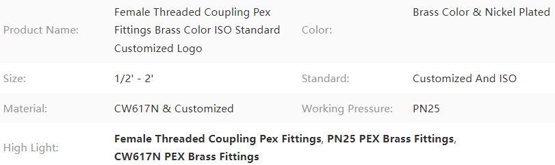 Female Threaded Coupling Pex Fittings Brass Color ISO StandardFemale Threaded Coupling Pex Fittings Brass Color ISO StandardFemale Threaded Coupling Pex Fittings Brass Color ISO StandardFemale Threaded Coupling Pex Fittings Brass Color ISO Standard